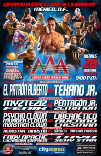 FBにあるAAAの公式ページより、11月17日月曜日の夜9時、レオン州のグアナフアト市にあるドモ・デ・ラ・フェリアで開催される興行のポスターを入手しましたので紹介したいと思います。 見所は4試合目のサイコ・サーカス対ヘルボーイズですかね。シベルネティ…